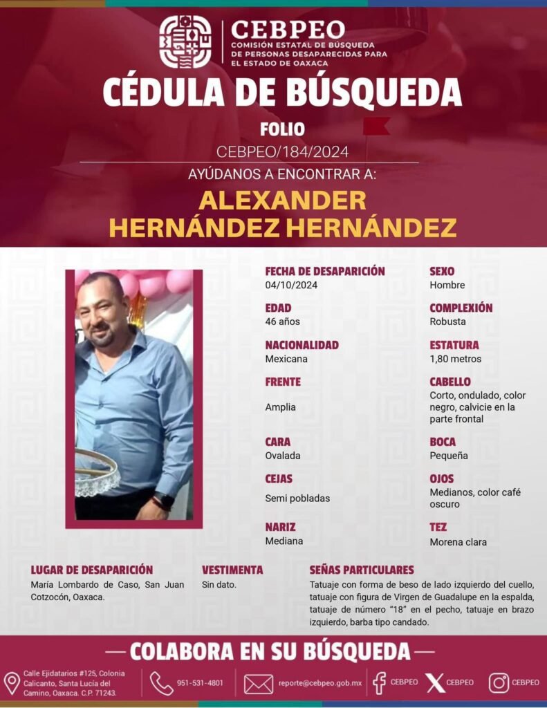 Dichas personas fueron vistas por última vez el 4 de octubre de 2024, en María Lombardo de Caso, San Juan Cotzocón, Oaxaca, sin que hasta la fecha se conozca su paradero.