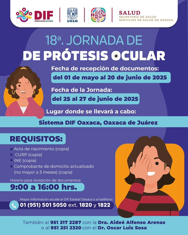 Oaxaca de Juárez. Oax. 14 de mayo de 2025.- Con el objetivo de atender a las personas que requieran una prótesis ocular, el Sistema Estatal para el Desarrollo Integral de la Familia (DIF) Oaxaca anunció la décimo octava jornada médica a llevarse a cabo del 25 al 27 de junio en la capital oaxaqueña.