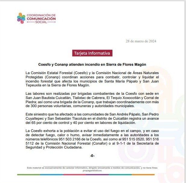 La Comisión Estatal Forestal (Coesfo) y la Comisión Nacional de Áreas Naturales Protegidas (Conanp) coordinan acciones para combatir, controlar y liquidar el incendio forestal que afecta los municipios de Santa María Pápalo y San Juan Tepeuxila en la Sierra de Flores Magón.