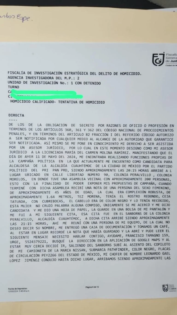 Posterior a ello, la candidata narró al Ministerio Público que mientras se encontraba en un evento de su campaña en la calle Libertad 90, en la colonia Morelos, alrededor de las 20:15 horas, una mujer le dio una hoja de papel, que guardó en una de las bolsas de su pantalón.
