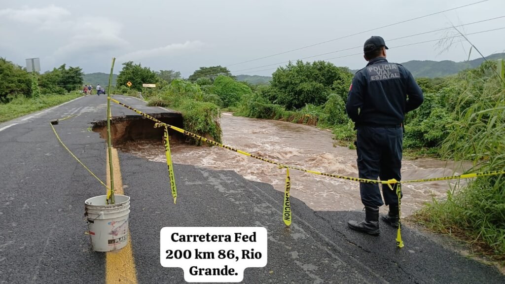 El Consejo Estatal de Protección Civil informa que se encuentra cerrada la Carretera Federal 200 en el kilómetro 86 a la altura del Puente Mancuernas, en Río Grande, Villa de Tututepec de Melchor Ocampo, en la región de la Costa.