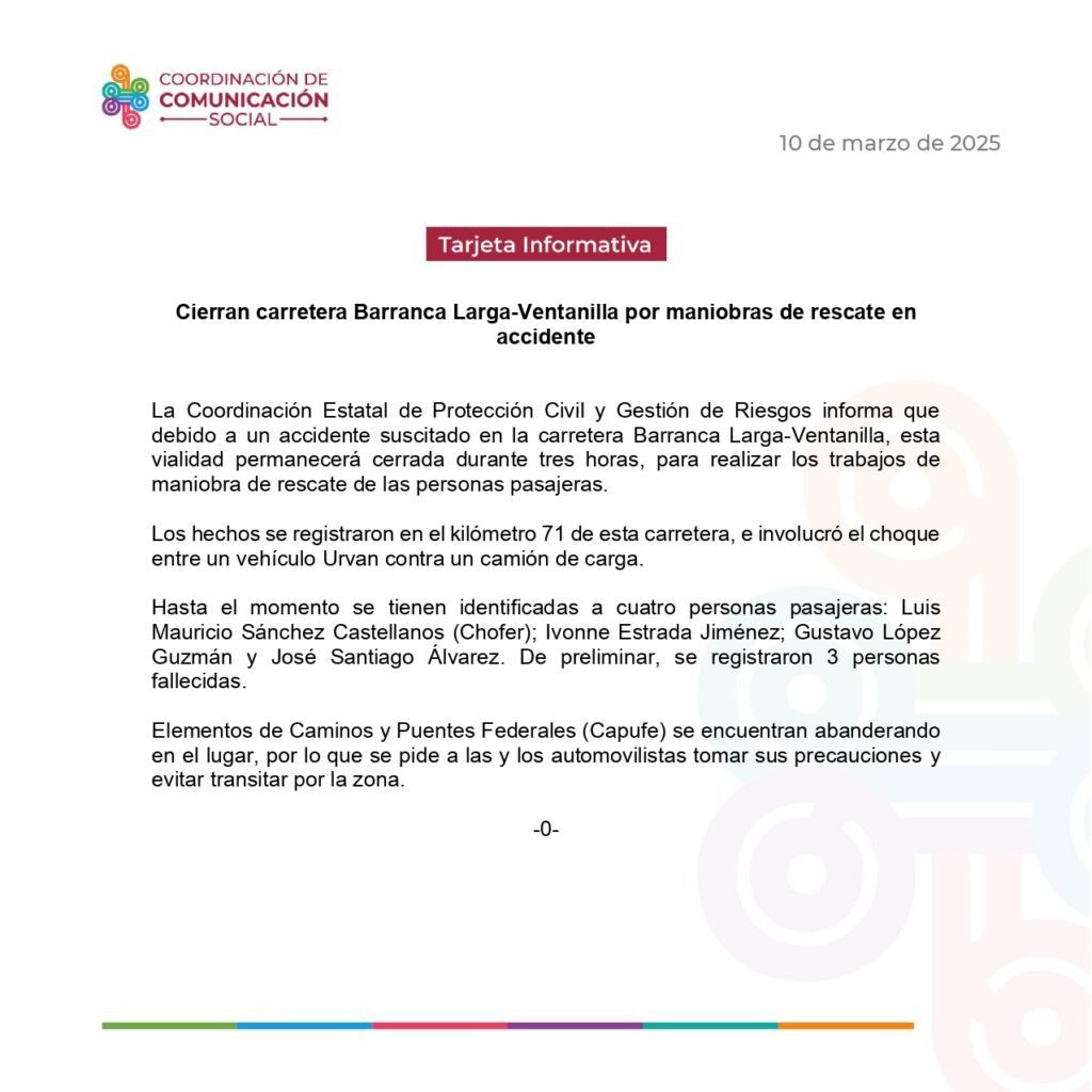 La Coordinación Estatal de Protección Civil y Gestión de Riesgos informa que debido a un accidente suscitado en la carretera Barranca Larga-Ventanilla, esta vialidad permanecerá cerrada durante tres horas, para realizar los trabajos de maniobra de rescate de las personas pasajeras.