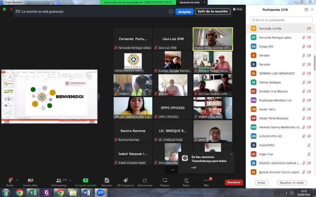 La capacitación fue impartida de manera virtual por el titular de la CEPCyGR Manuel Alberto Maza Sánchez y la jefa del Departamento de Asesoría Comunitaria y Enlace Regional y Municipal Ana Luisa Cabrera Ramírez, con el objetivo de brindar los conocimientos básicos de protección civil para salvaguardar la integridad física y emocional de la población.