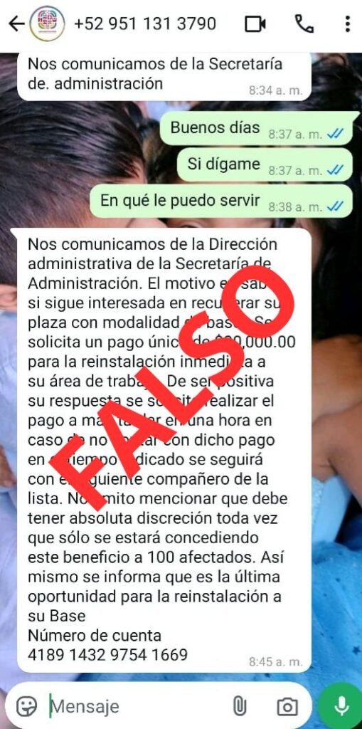 Tlalixtac de Cabrera, Oax. 11 de febrero de 2024.- La Secretaría de Administración del Gobierno del Estado de Oaxaca afirma que es falsa la información que circula en redes sociales sobre el supuesto cobro para la reinstalación de bases, que fueron revocadas en meses anteriores.