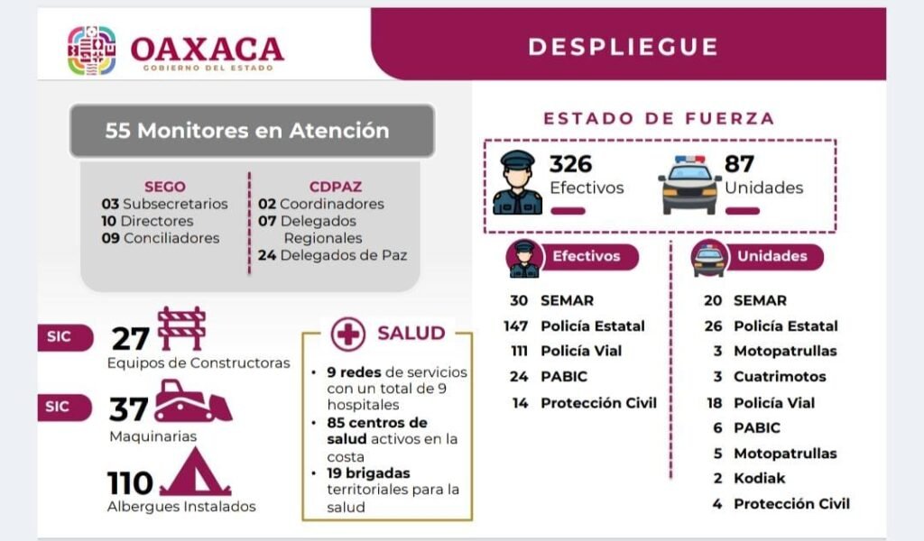 Asimismo, la Secretaría de Infraestructuras y Comunicaciones proporcionó 27 equipos de constructoras, 37 maquinarias y se instalaron 110 albergues, aunado a 25 unidades -entre retroexcavadoras, pipas de agua, tractores y demás- en el municipio de Santa María Huatulco.