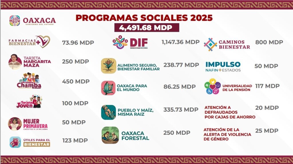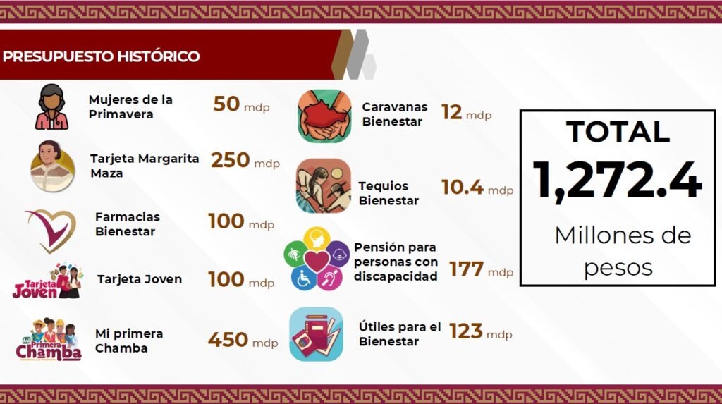 La Sebienti informó que, este año, mil 272.4 millones de pesos serán invertidos en los programas: Mujer de la Primavera con 50 millones de pesos; Tarjeta Margarita Maza tendrá 250 millones de pesos; Farmacias Bienestar contará con 100 millones de pesos; Tarjeta Joven recibirá 100 millones de pesos; Mi Primera Chamba, Experiencia que Transforma tendrá 450 millones de pesos.