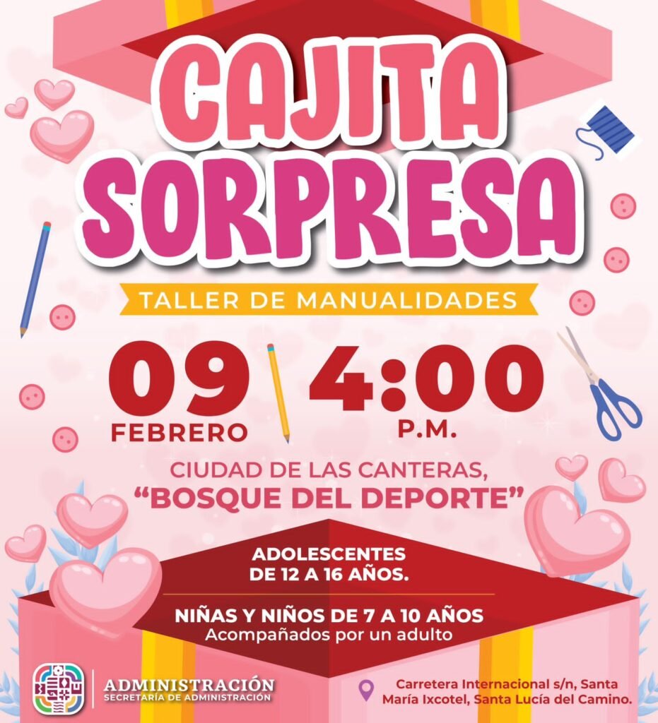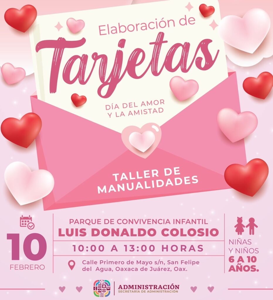 El sábado 10 de febrero, en la Unidad Deportiva Santa Lucía Capce a las 12:00 horas, mujeres adultas están invitadas a unirse al taller de manualidades Rosa Eterna; mientras que en el parque de Convivencia Infantil Luis Donaldo Colosio Murrieta, a las 13:00 horas, se realizará el taller Elaboración de tarjetas para el Día del Amor y la Amistad, dirigido a niñas y niños de 6 a 10 años.
