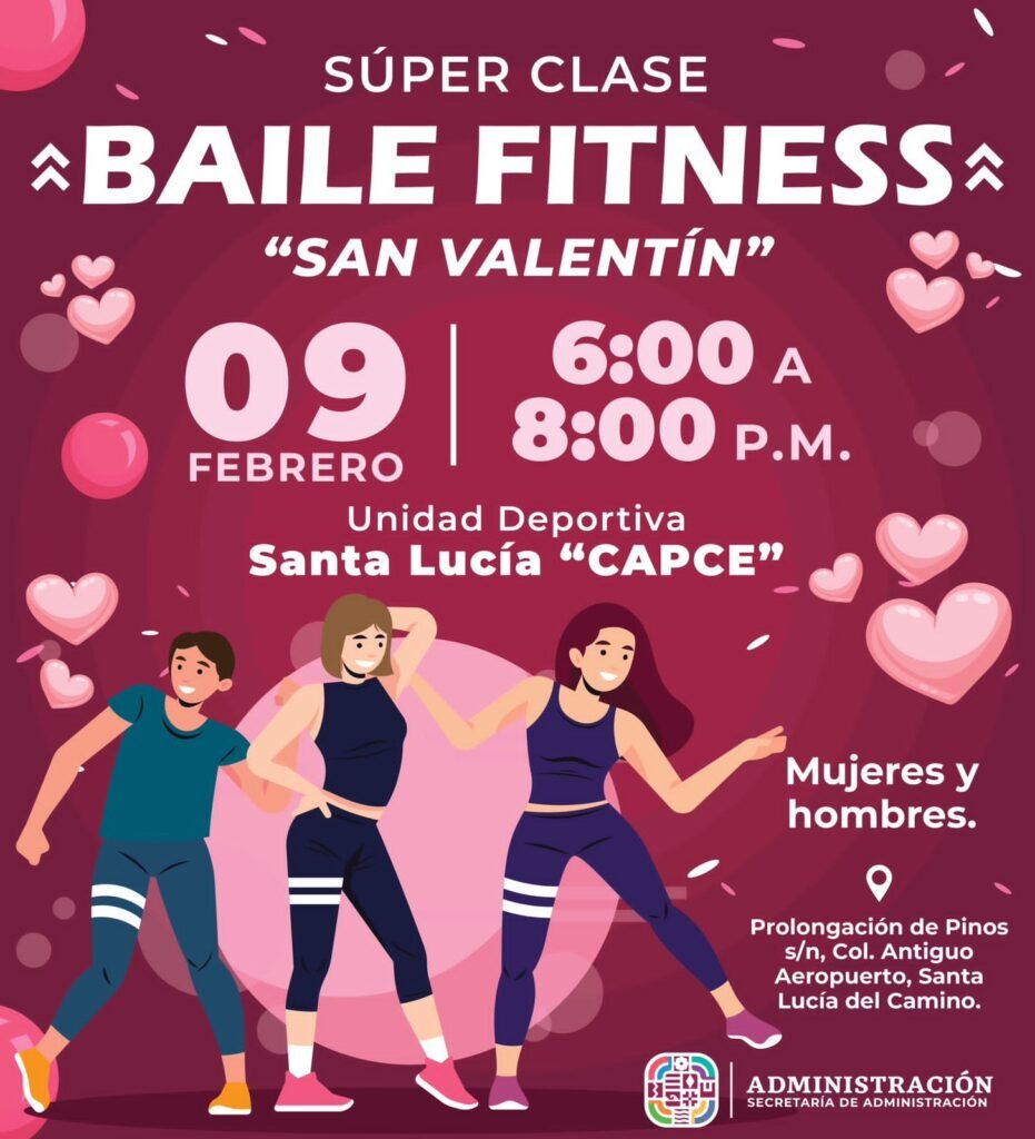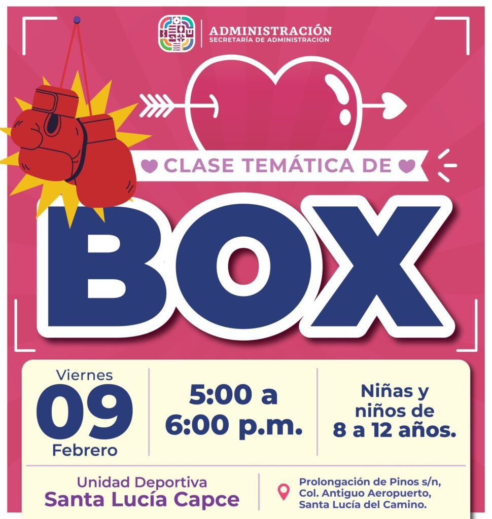 En la Unidad Deportiva Santa Lucía Capce, el viernes 9 de febrero se impartirá una clase temática de box dirigida a niñas y niños de 8 a 12 años, en un horario de 17:00 a 18:00 horas; en este mismo parque, pero a las 18:00 horas, se llevará a cabo la súper clase baile fitness San Valentín, dirigida a personas adultas.