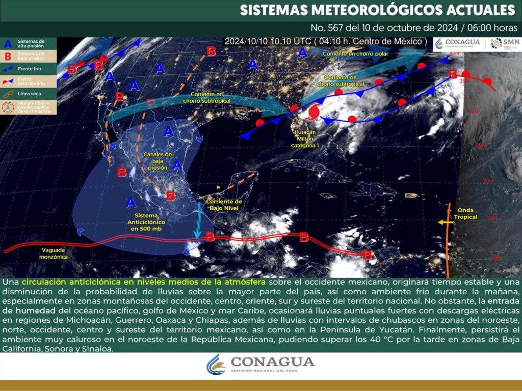 Oaxaca de Juárez, Oax. 10 de octubre de 2024.- La Coordinación Estatal de Protección Civil y Gestión de Riesgos (CEPCyGR) informa que para este jueves se establecerá una circulación anticiclónica –evento que genera tiempo estable-, favoreciendo cielos poco nubosos que disminuirán la probabilidad de lluvias en el estado.