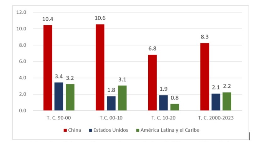 Por otra parte –a decir del que será el secretario del Departamento de Estado, Marco Rubio–, China es “el adversario más poderoso y el más peligroso”[3]. Con datos del Banco Mundial, la tasa de crecimiento del producto interno bruto (PIB) de Estados Unidos y China muestra un mayor dinamismo el país asiático. De 1990 a 2000, la tasa de crecimiento del PIB chino fue de 10.4 por ciento, mientras que el de Estados Unidos fue de 3.4 por ciento. De 2000 a 2023, es más dinámica la economía China con una tasa de crecimiento de 8.3 por ciento, mientras que para Estados Unidos es apenas del 2.1 por ciento, como se detalla en la gráfica siguiente.