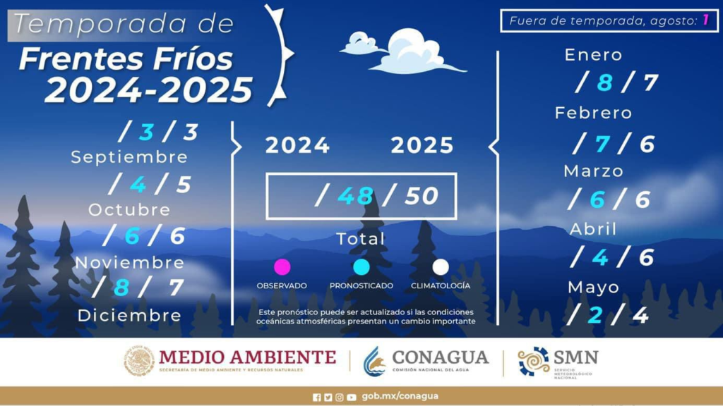 Con la información emitida por el Servicio Meteorológico Nacional (SMN), se pronostica el arribo a México de septiembre a mayo de 48 sistemas frontales (frentes fríos), así como el desarrollo de siete tormentas invernales.