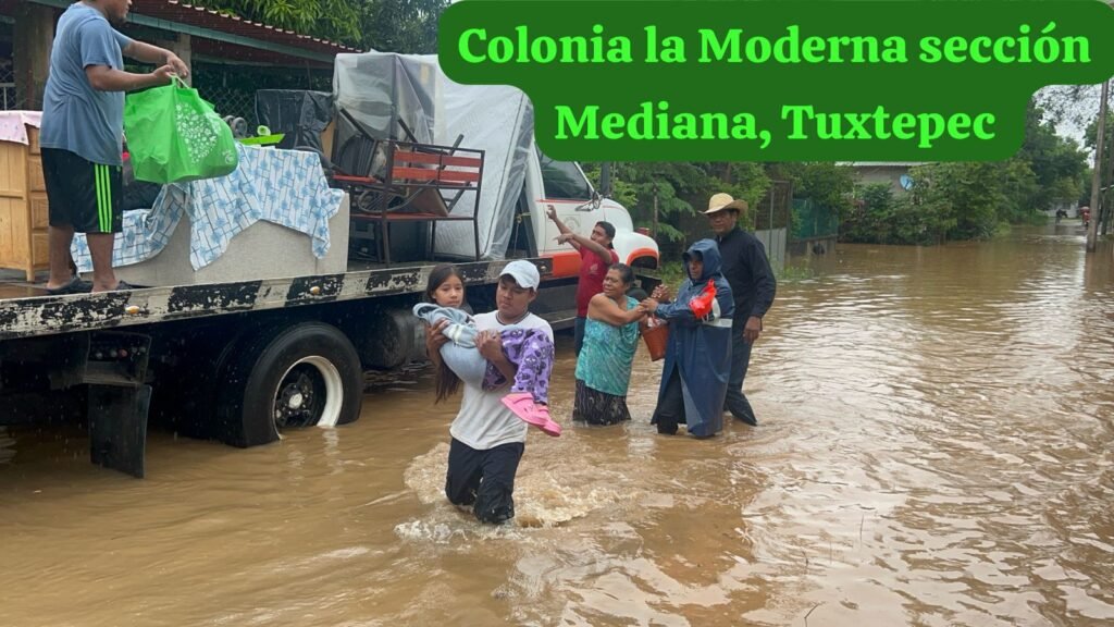 Elementos de la Policía Vial brindan auxilio y realizan el desalojo de habitantes de la colonia La Moderna, Sección Mediana, en San Juan Bautista, Tuxtepec, luego de registrarse el desbordamiento del arroyo San Jacinto.