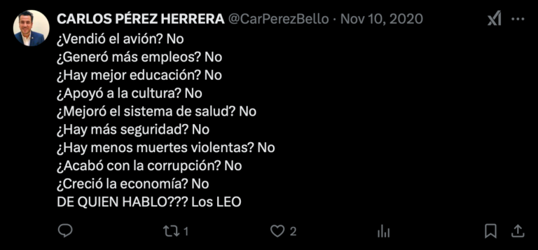 Publicación de Carlos Pérez Herrera criticando al presidente Andrés Manuel López Obrador en noviembre de 2020.