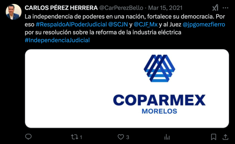 Publicación de Carlos Pérez Herrera mostrando su apoyo al juez Gómez Fierro por haber otorgado suspensión definitiva a la reforma a la industria eléctrica en marzo de 2021.