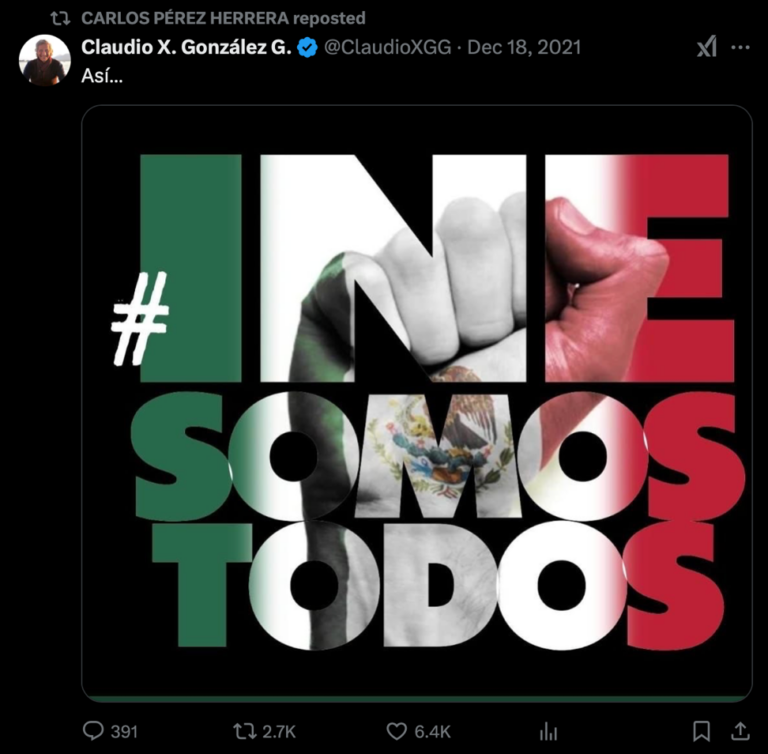 Publicación de Carlos Pérez Herrera “retuiteando” el mensaje de Claudio X a favor de la campaña #INEsomostodos