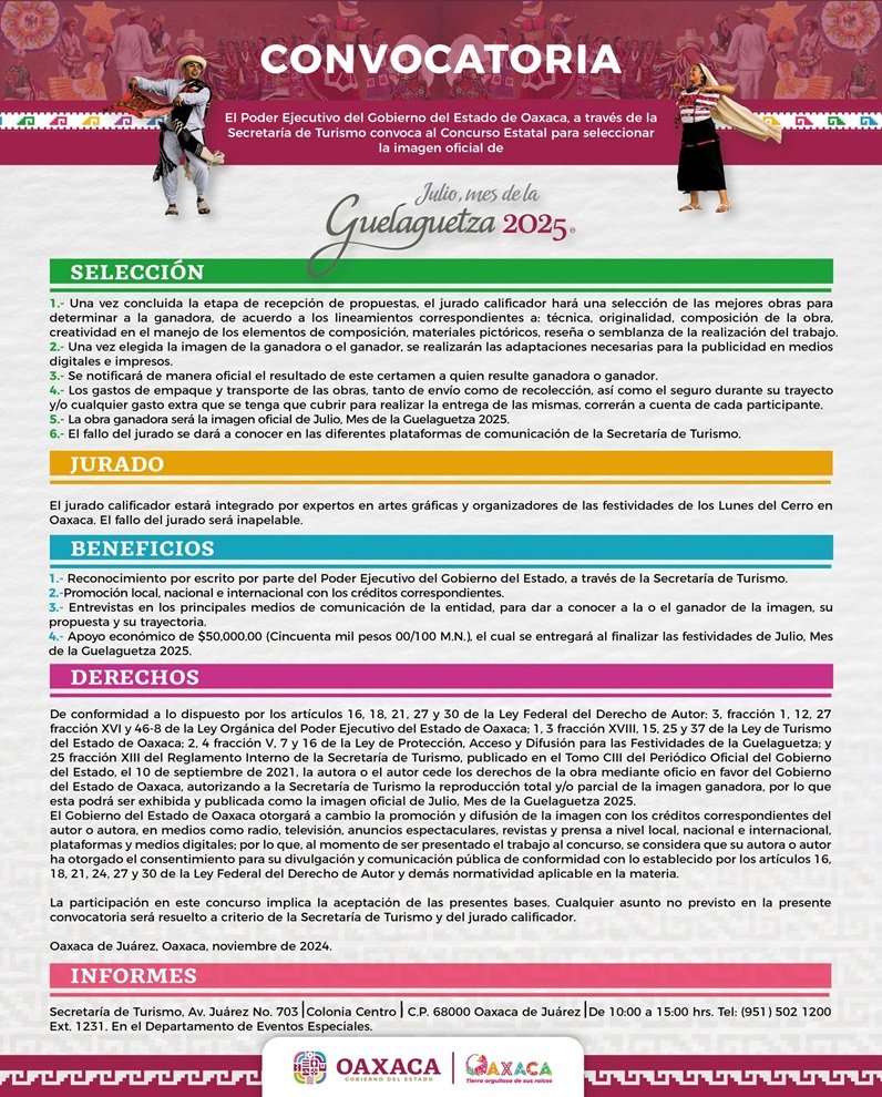 Oaxaca de Juárez, Oax. 30 de diciembre de 2024.- El Gobierno del Estado a través de la Secretaría de Turismo (Sectur Oaxaca) informa que las personas que deseen participar en el concurso para seleccionar la imagen oficial de “Julio, mes de la Guelaguetza 2025”, tienen hasta el 10 de enero para registrar su obra.