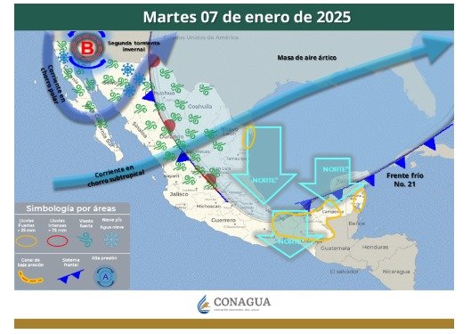 Además, este sistema provocará evento de norte fuerte a muy fuerte en especial en el tramo carretero La Venta-La Ventosa, con rachas que pudieran alcanzar los 100 km/h durante este martes y parte del miércoles, trasladándose hacia aguas del Golfo de Tehuantepec, donde se presentará oleaje anormal.