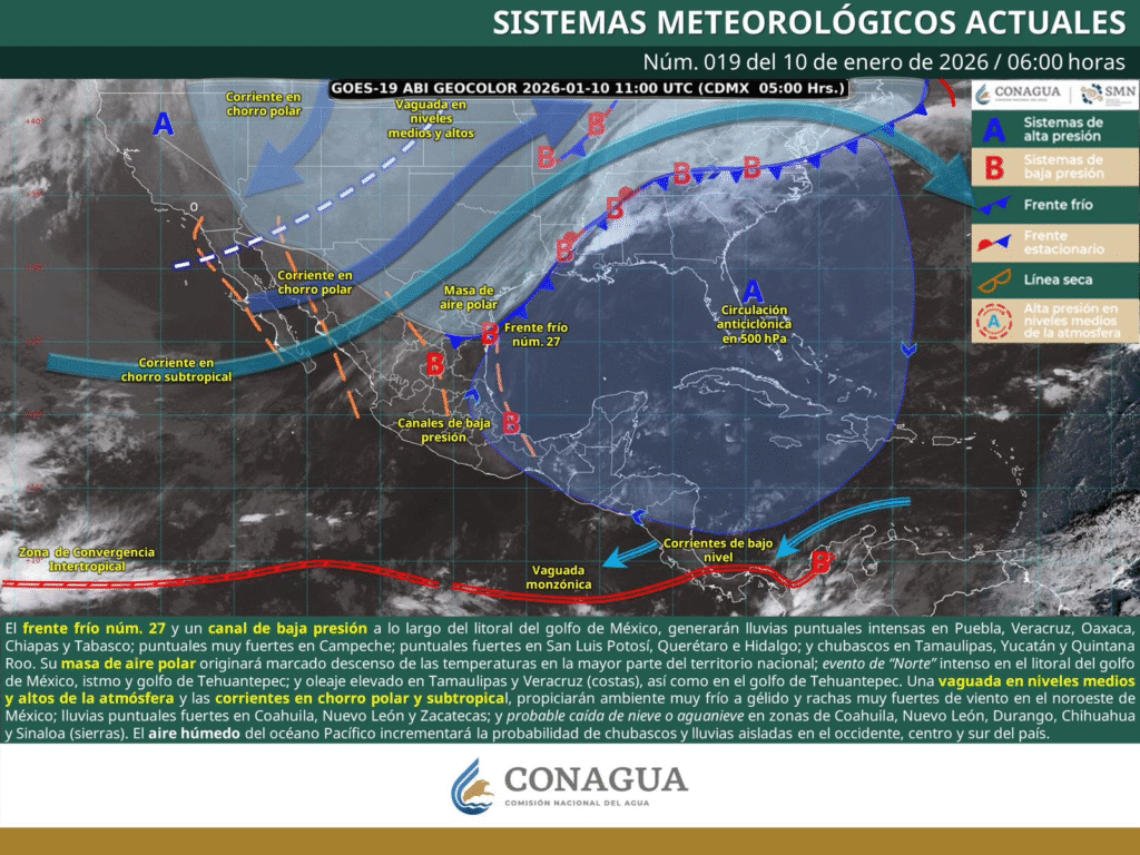 Frente frío número 27 dejará lluvias fuertes, evento de norte y ambiente fresco