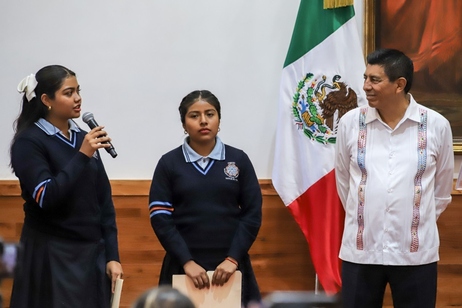 Oaxaca de Juárez, Oax. 3 de septiembre de 2024.- A nombre del pueblo de Oaxaca, el Gobernador Salomón Jara Cruz reconoció a las estudiantes del Bachillerato Integral Comunitario de Teotitlán del Valle (BIC 29), Shanni Valeria Mora Fajardo y Rosa Mendoza Sosa, por obtener el Diploma de Excelencia en el certamen internacional en el Premio Juvenil del Agua Estocolmo 2024 (Stockholm Junior Water Prize).