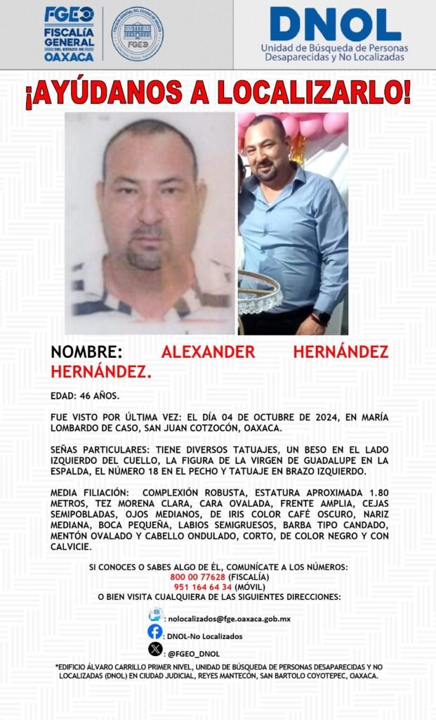 Oaxaca de Juárez, Oax. 09 de octubre de 2024.- La Fiscalía General del Estado de Oaxaca (FGEO) realiza las labores de búsqueda y localización de Sandra Estefania Domínguez Martínez y Alexander Hernández Hernández, quienes fueron reportados como no localizados por lo que se realizan las indagatorias aplicando los protocolos especializados en los que incluye la perspectiva de género.