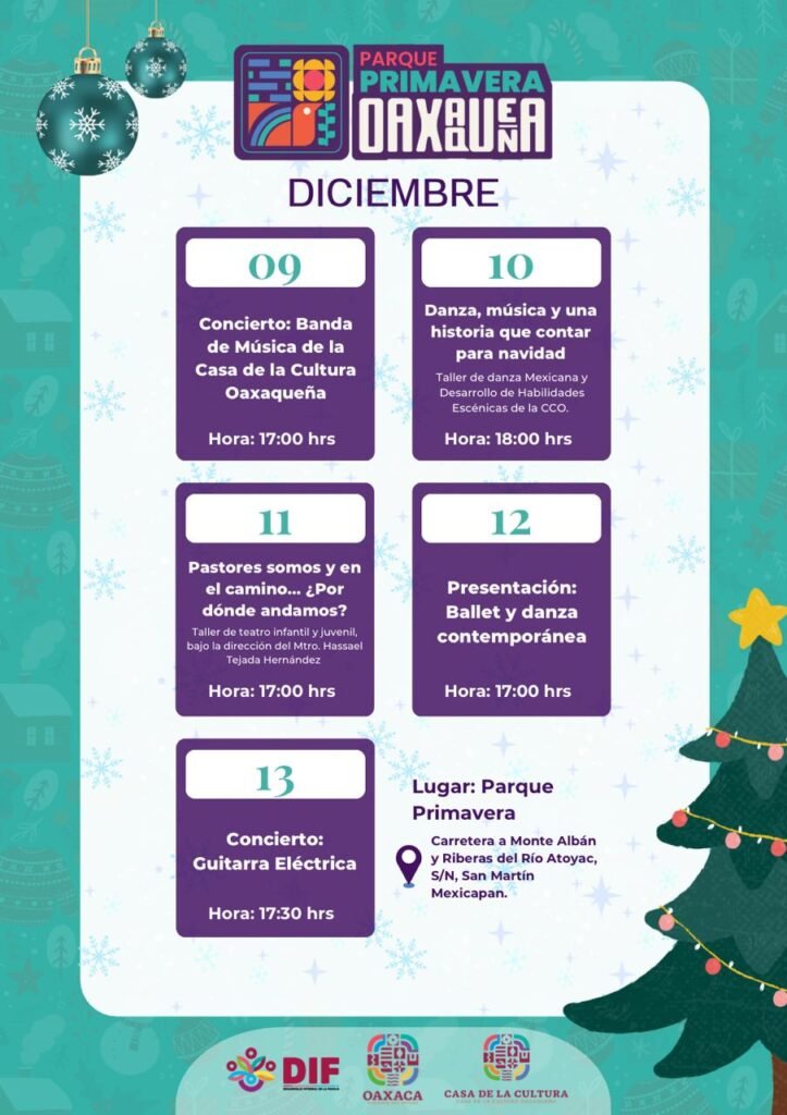 De igual forma, el Parque Primavera Oaxaqueña tendrá la “Presentación: Ballet y danza contemporánea”, este 12 de diciembre a las 17:00 horas, además del “Concierto: Guitarra Eléctrica”, el 13 de diciembre a las 17:30 horas.