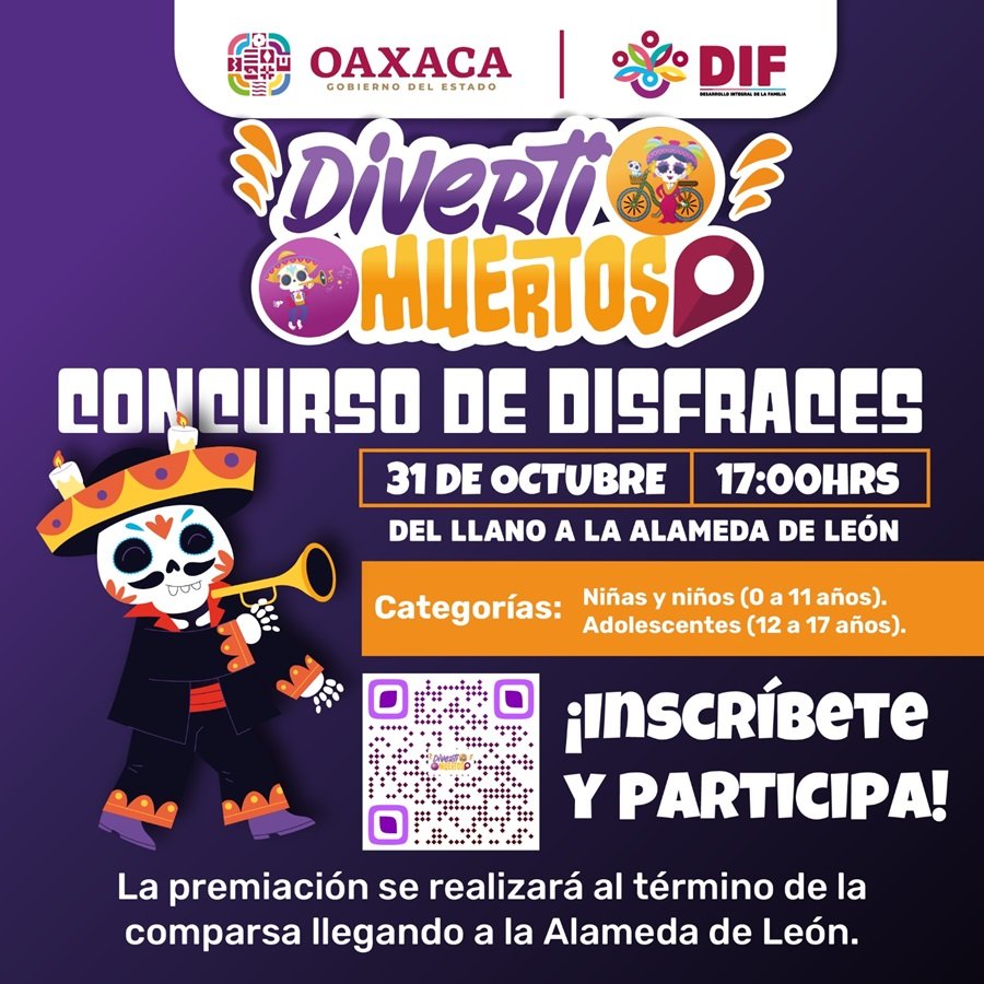 El registro para el concurso será a través del correo electrónico comunicacion@difoaxaca.gob.mx o el código QR del cartel oficial del Segundo concurso de disfraces Diverti Muertos publicado en las redes sociales oficiales del Sistema DIF Oaxaca en Instagram, Facebook y X, del 17 al 30 de octubre.