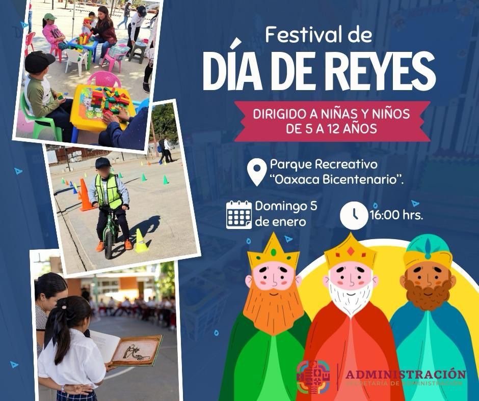 Tlalixtac de Cabrera, Oax. 2 de enero de 2025.- Para promover la convivencia familiar, la Secretaría de Administración, a través de la Coordinación de Espacios Públicos, realizará el Festival de Día de Reyes, este domingo 5 de enero, a las 16:00 horas, en el Parque Recreativo Infantil Oaxaca Bicentenario, ubicado en Boulevard Eduardo Vasconcelos número 617, Oaxaca de Juárez.