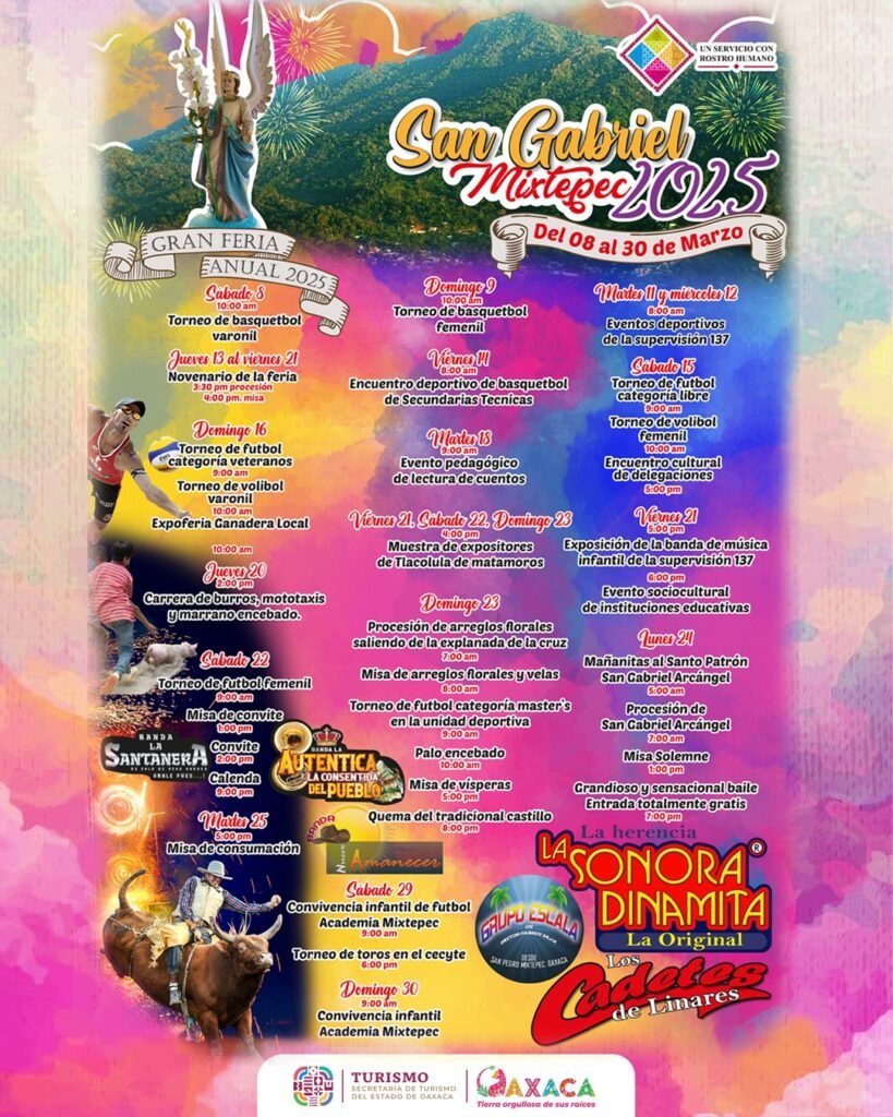 Oaxaca de Juárez, Oax. 10 de marzo de 2025.- La Secretaría de Turismo del Estado (Sectur Oaxaca) invita a disfrutar de la Gran Feria Anual 2025 de San Gabriel Mixtepec, que se celebra del 8 al 30 de marzo con actividades deportivas, culturales, sociales y religiosas.