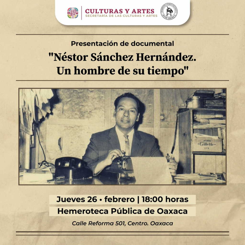 Oaxaca de Juárez, Oax., 26 de febrero de 2026.- La Secretaría de las Culturas y Artes de Oaxaca (Seculta) invita a la proyección gratuita del documental “Néstor Sánchez Hernández – Un hombre de su tiempo”, que se realizará este jueves a las 18:00 horas en la Hemeroteca Pública que lleva su nombre, ubicada en el Centro Cultural Santo Domingo.