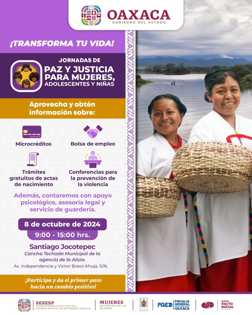 Oaxaca de Juárez, Oax., 3 de octubre de 2024.- El Gobierno de Oaxaca a través del Secretariado Ejecutivo del Sistema Estatal de Seguridad Pública (SESESP) llevará las Jornadas de Paz y Justicia para Mujeres, Adolescentes y Niñas, así como como la Jornada de Paz Penitenciaria a la región del Papaloapan.