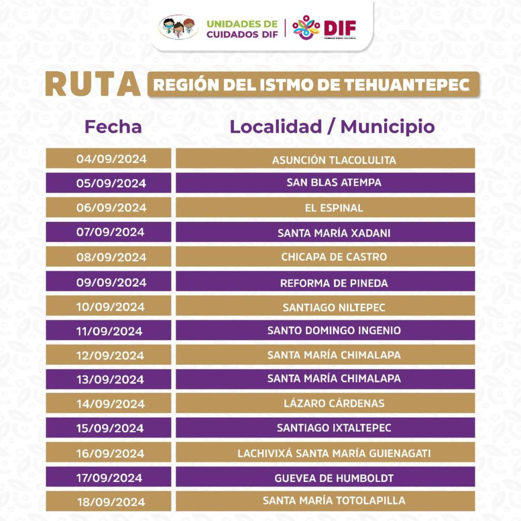 El recorrido comenzará este miércoles 4 de septiembre en el municipio de Asunción Tlacolulita, para continuar el 5 en la Heroica Villa de San Blas Atempa, el 6 en El Espinal, el 7 en Santa María Xadani y el 8 en la localidad Chicapa de Castro perteneciente a la Heroica Ciudad de Juchitán de Zaragoza.