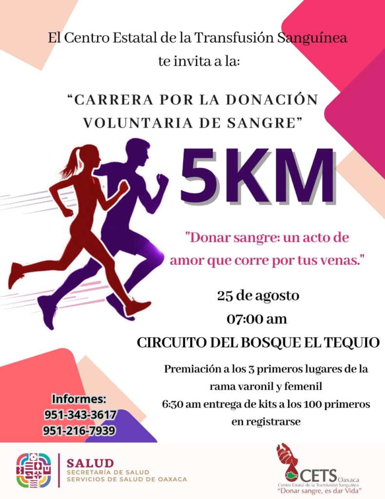Oaxaca de Juárez, Oax. 22 de agosto de 2024.- El próximo domingo 25 de agosto en el Bosque El Tequio, se llevará a cabo la carrera atlética de 5 kilómetros, para fomentar la donación de sangre, informó Servicios de Salud de Oaxaca (SSO).