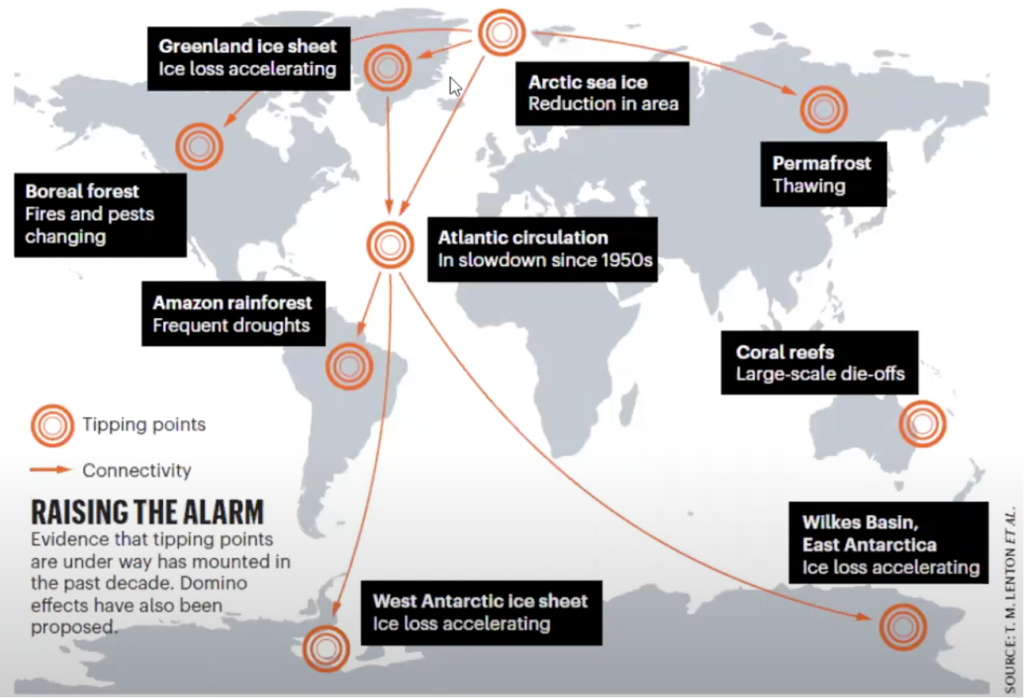 Figura 3: Algunos de los puntos de inflexión (círculos naranja), y cómo interaccionan entre ellos (líneas amarillas). Imagen tomada de Lenton et al. 2019