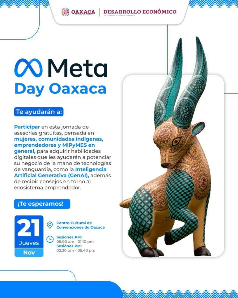 Oaxaca de Juárez, Oax. 11 de noviembre de 2024.- La Secretaría de Desarrollo Económico (Sedeco) invita a inscribirse gratuitamente en “Meta Day Oaxaca”, evento en el cual se brindarán capacitaciones en el manejo de plataformas digitales para impulsar los negocios.