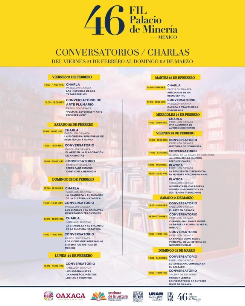Detalló que esto incluye más de 70 actividades que mostrarán la vitalidad cultural de Oaxaca y su papel como referente en la producción literaria y artística del país. Entre estas destacan: 15 actividades culturales y artísticas, como son mesas redondas, conferencias, conciertos, talleres de fomento a la lectura y exposiciones; 21 conversatorios y charlas; 33 presentaciones de libros y exposiciones, así como siete talleres y cuatro recitales.