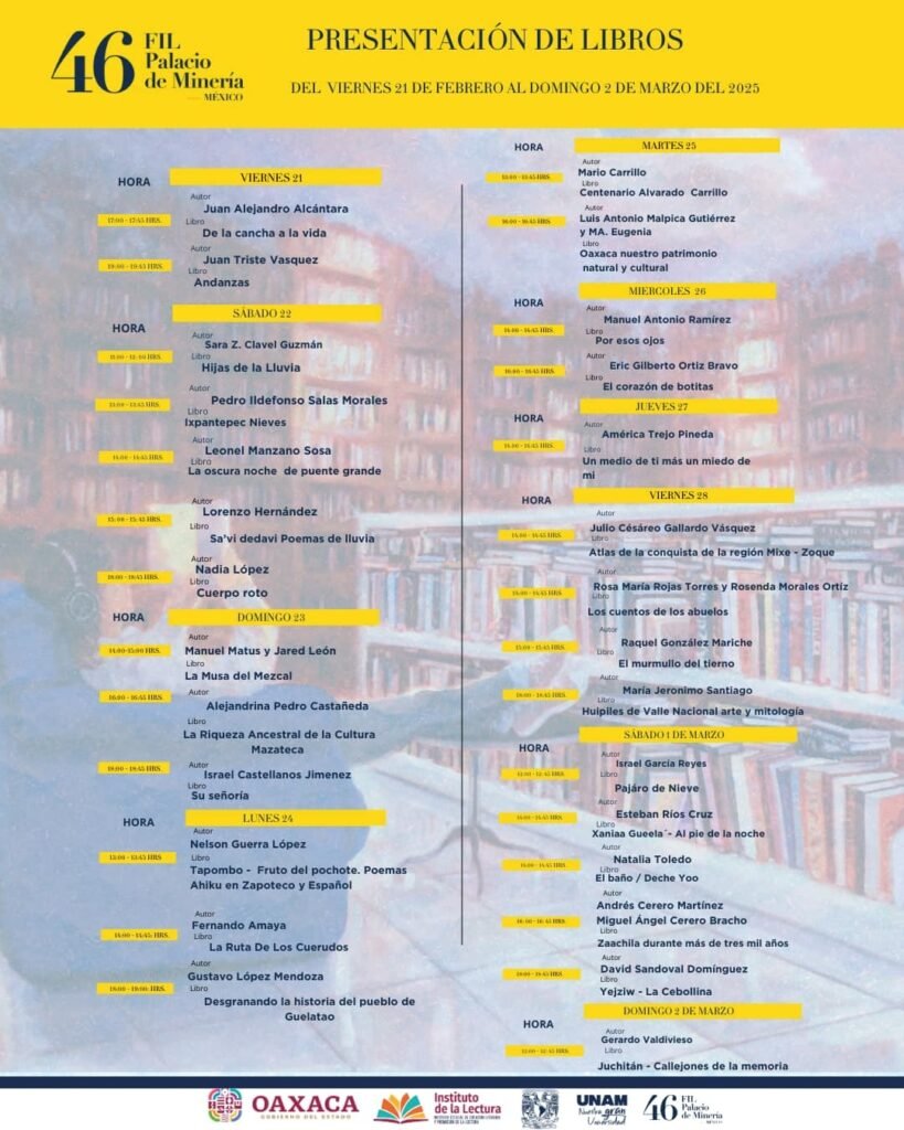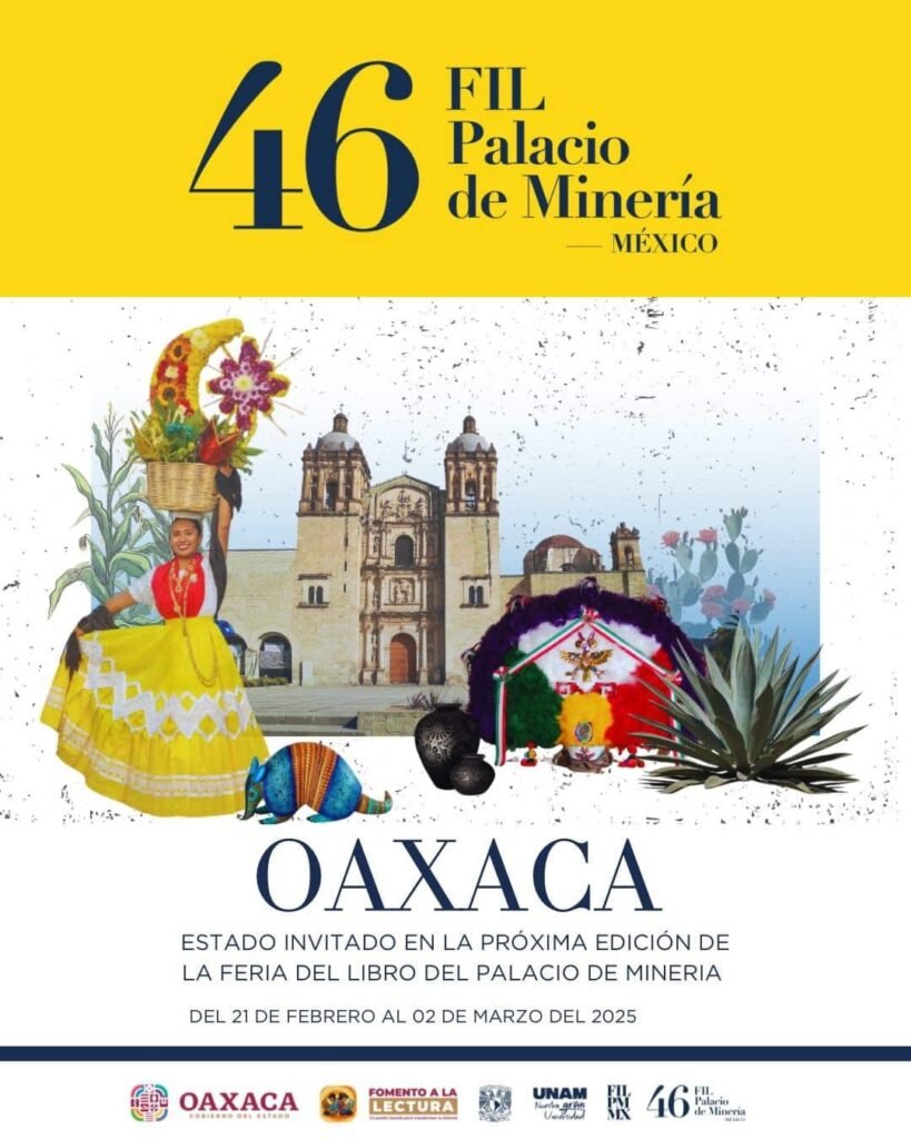 Oaxaca de Juárez, Oax., 19 de febrero de 2025.- Oaxaca exhibirá la riqueza de su acervo cultural y literario, como estado invitado de honor en la 46 edición de la Feria Internacional del Libro del Palacio de Minería (FILPM), evento literario más antiguo de México, que se celebrará del 21 de febrero al 2 de marzo.
