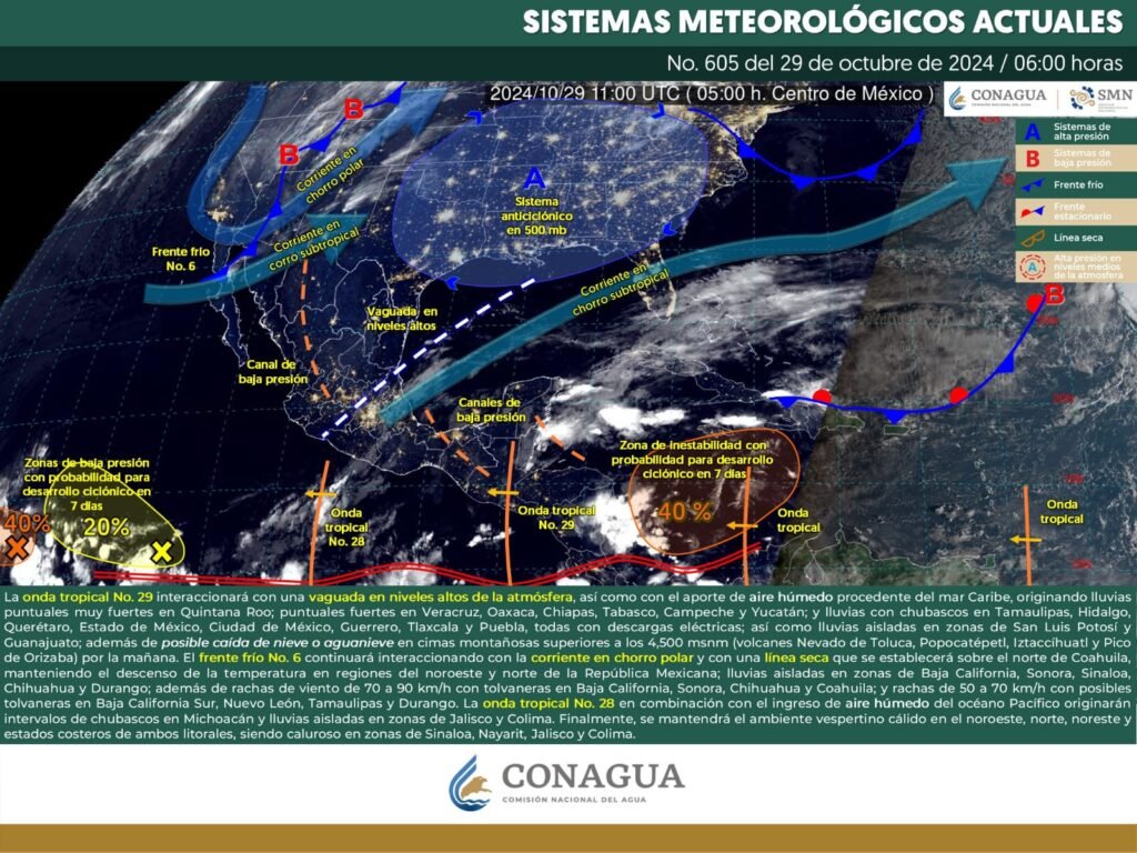 Por otra parte, el frente frío número 6, se mantiene poco definido y se extiende sobre el norte del país; sin embargo, las bajas temperaturas al amanecer y durante la noche seguirán dominando en las regiones Mixteca, Sierra de Juárez y Sierra Sur, en las que también se espera el desarrollo de áreas de niebla.