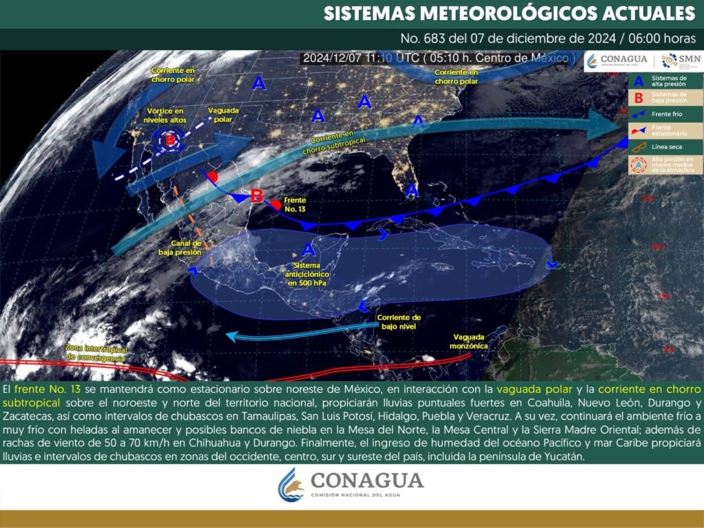 Mientras tanto, el frente frío número 13 adquirió características de estacionario en límites de Tamaulipas y Texas.