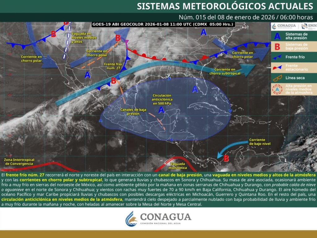 Lo anterior, se debe a una circulación anticiclónica que se desplazará durante este jueves hacia el oriente del Golfo de México, permitiendo el ingreso del frente frío número 27, el cual tendrá efectos directos y traerá mezclas invernales durante el fin de semana.