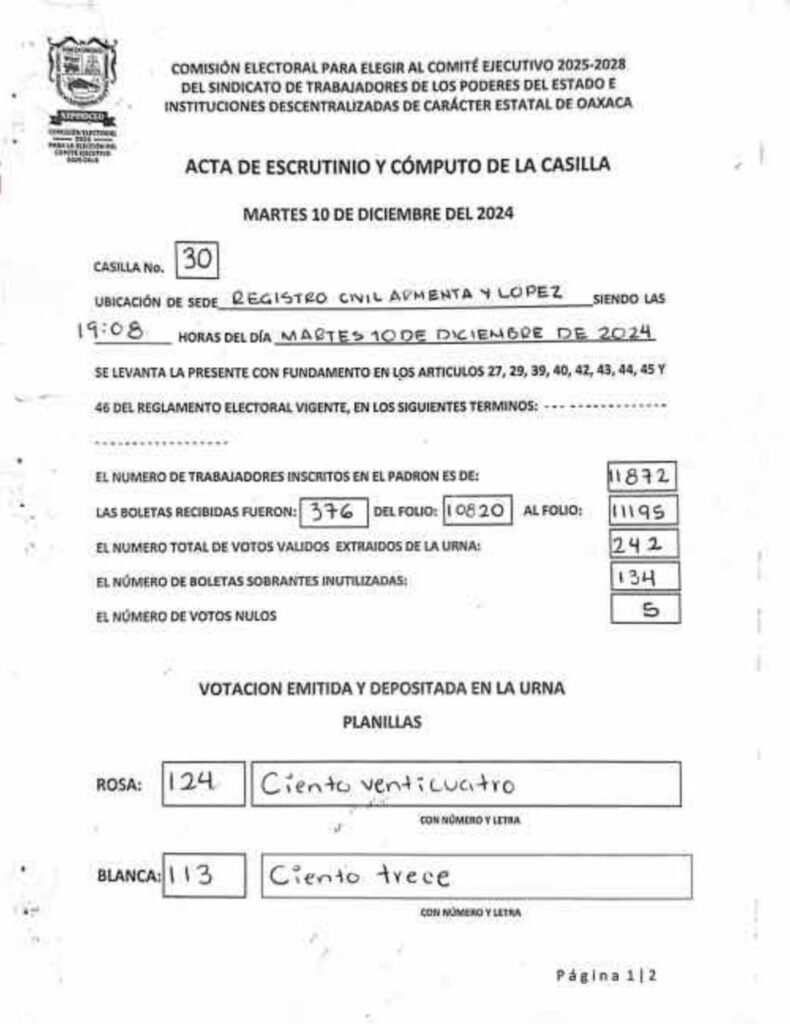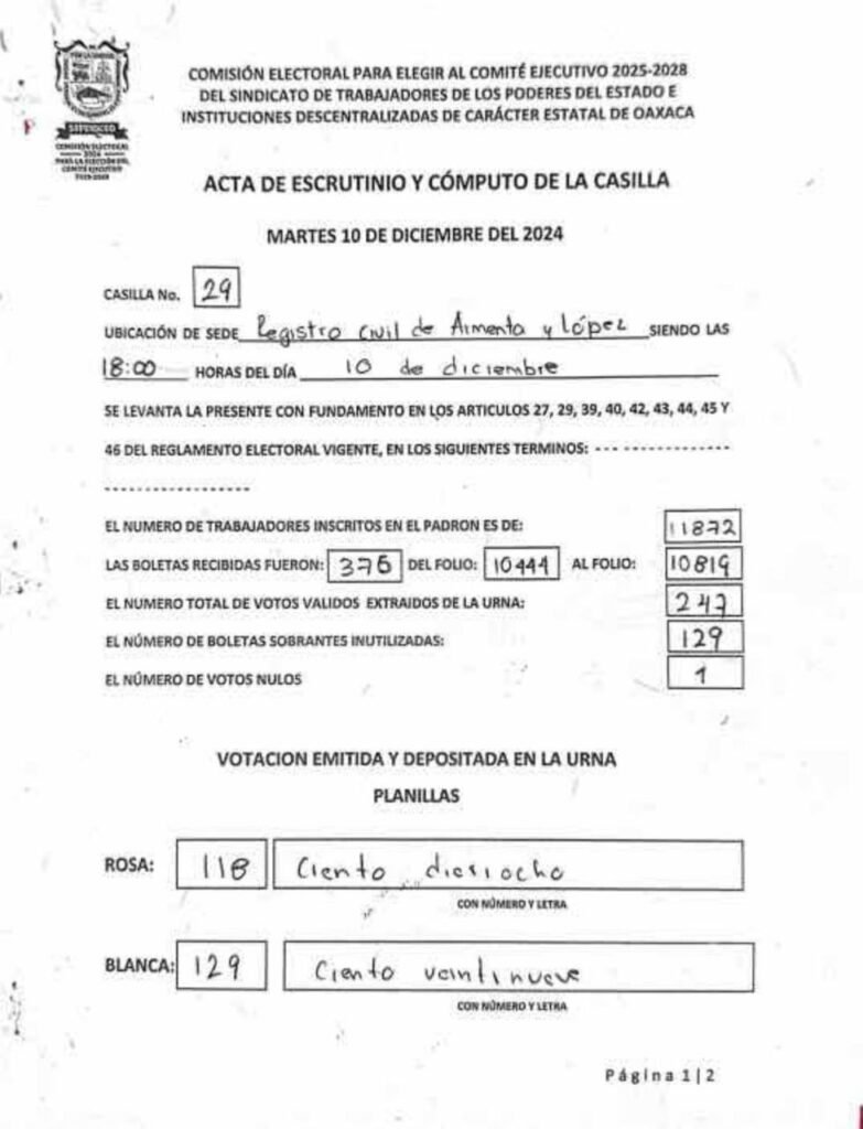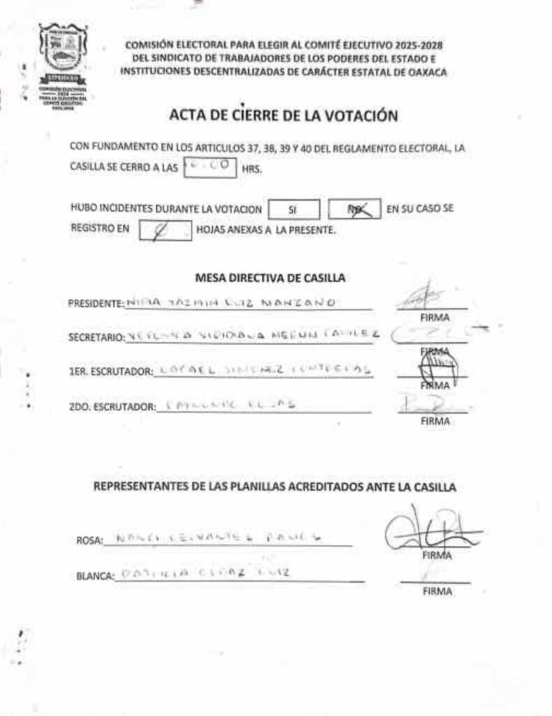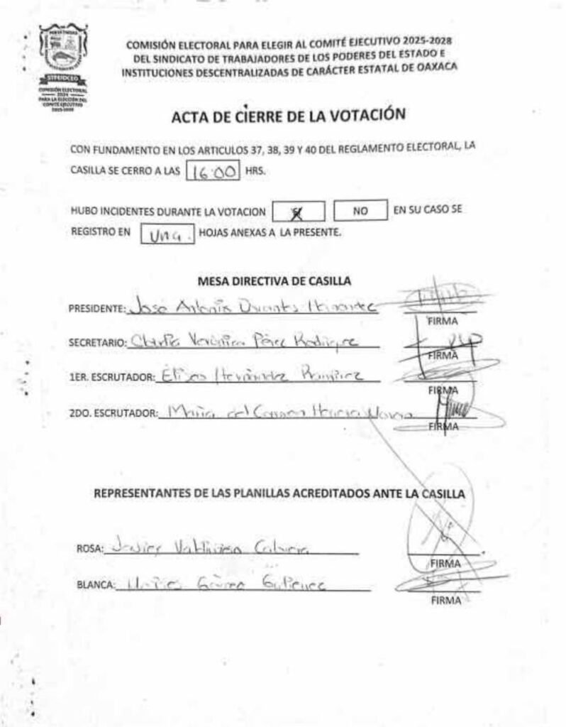 En declaración, el representante legal de la Planilla Rosa; Lic. Enrique Aguilar, hace públicas las actas de escrutinio y cómputo de esas casillas, ya que es sabido que la vocal de la comisión electoral de dicho sindicato se llevo el paquete de boletas a su casa; quien no se presentó a la sesión del día de ayer.
