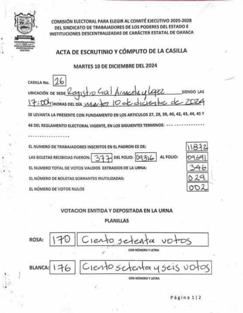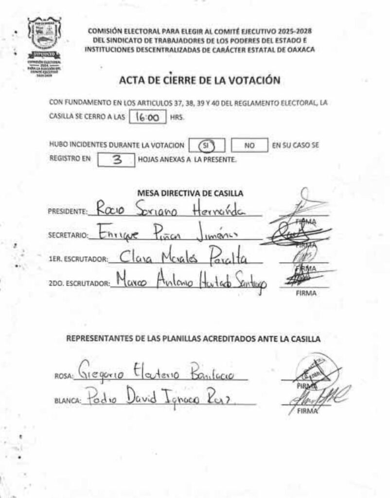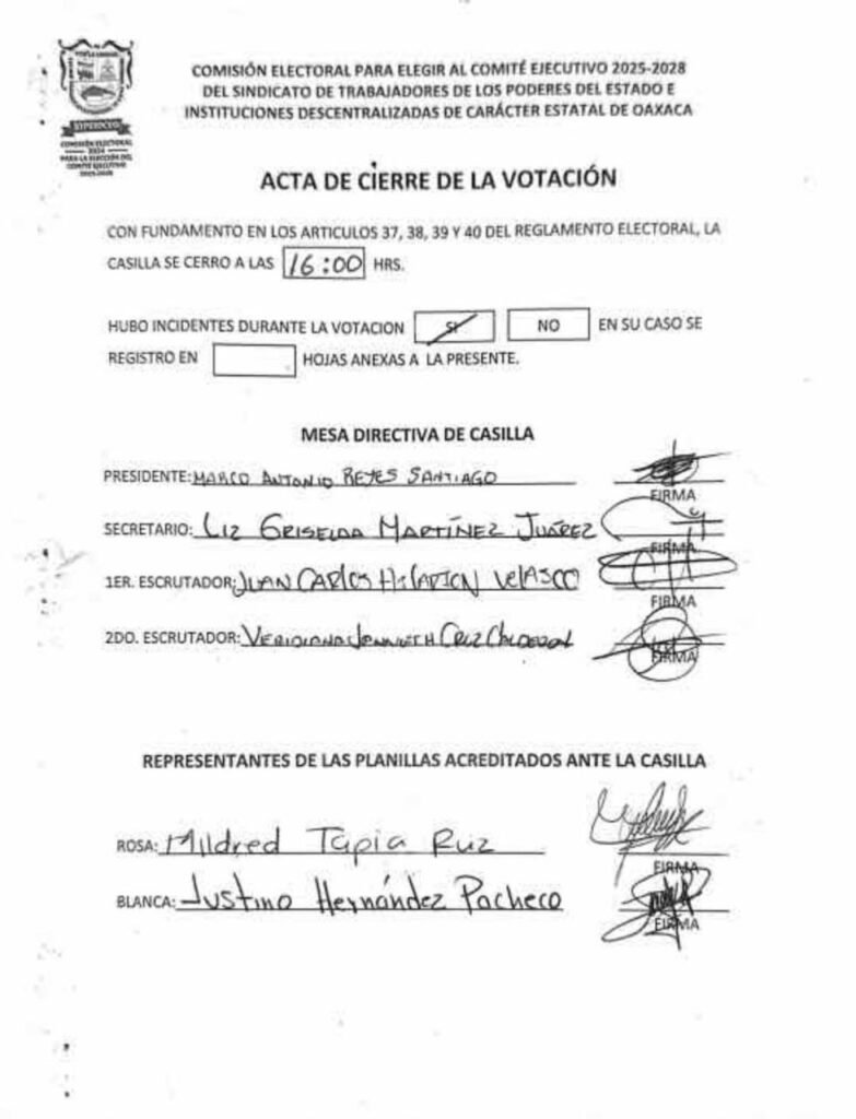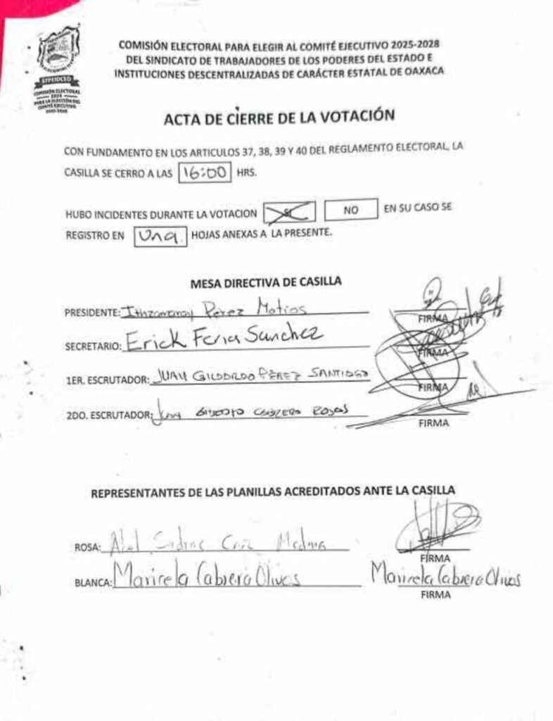 En declaración, el representante legal de la Planilla Rosa; Lic. Enrique Aguilar, hace públicas las actas de escrutinio y cómputo de esas casillas, ya que es sabido que la vocal de la comisión electoral de dicho sindicato se llevo el paquete de boletas a su casa; quien no se presentó a la sesión del día de ayer.