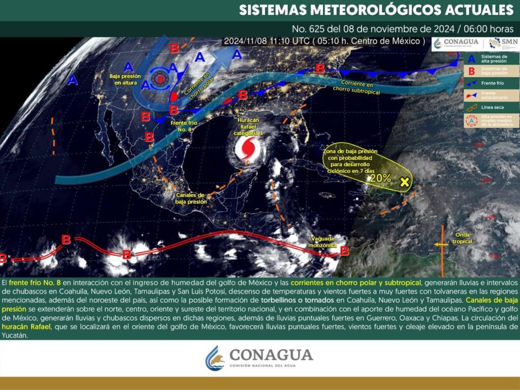El huracán “Rafael” se ubica sobre el Golfo de México, por el momento sus bandas espirales afectan a la Península de Yucatán, un anticiclón lo está empujando hacia el oeste, con un escenario incierto en los próximos días.