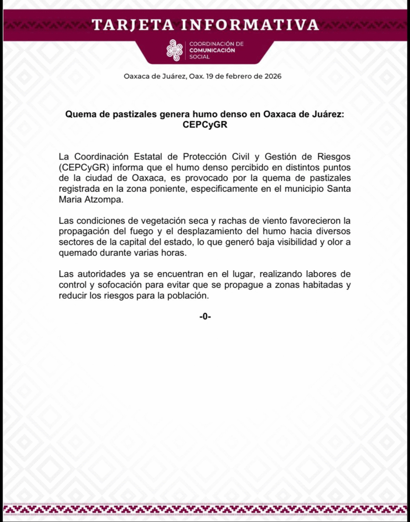 La Coordinación Estatal de Protección Civil y Gestión de Riesgos (CEPCyGR) informa que el humo denso percibido en distintos puntos de la ciudad de Oaxaca, es provocado por la quema de pastizales registrada en la zona poniente, específicamente en el municipio Santa María Atzompa.