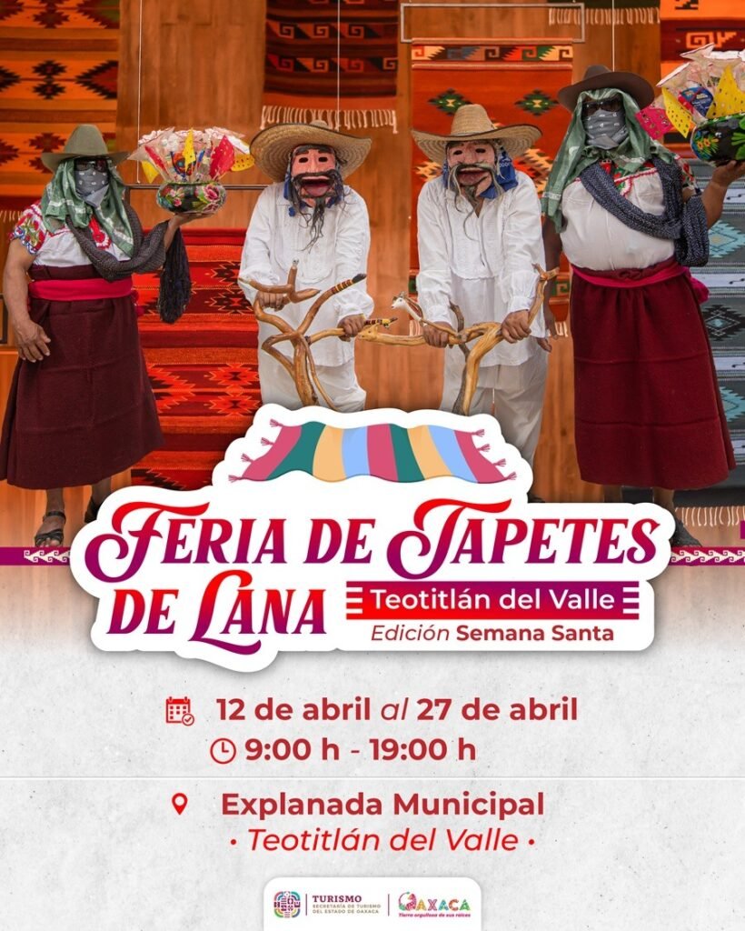 Oaxaca de Juárez, Oax., 11 de abril de 2025.- En el marco de la temporada de Semana Santa, Teotitlán del Valle realizará la Feria de Tapetes de Lana, del 12 al 27 de abril, en la explanada municipal de la población, en un horario de 9:00 a 19:00 horas.