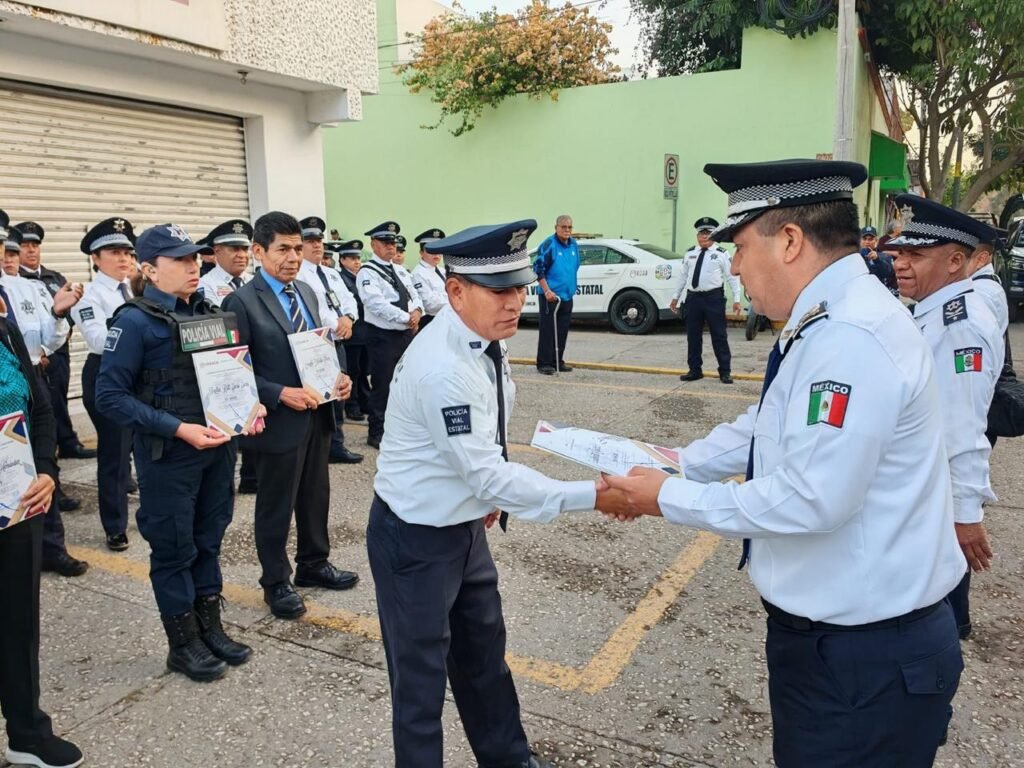 La Policía Vial del Estado reconoció la trayectoria de Hermelinda Zárate Morales por 31 años de servicio; Humberto Alejandro Reyes Medina, por 32 años; Alfonso Blas Castellanos por 33 años; Ana María Pérez Huerta por 34 años;