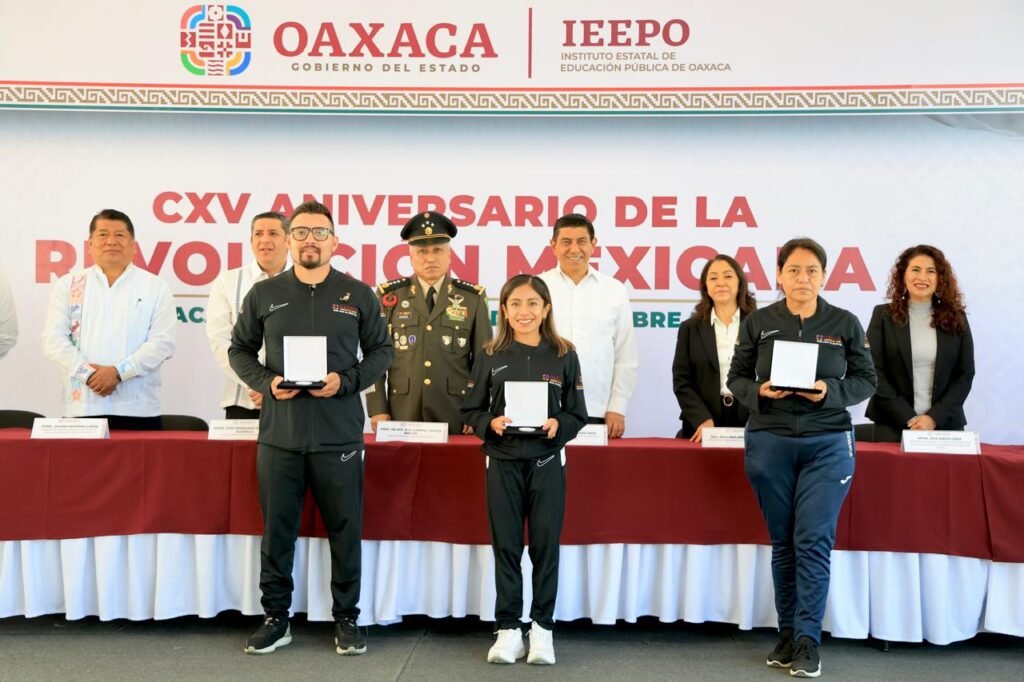 • El Mandatario estatal junto a la Presidenta Honoraria del Sistema DIF Oaxaca, Irma Bolaños Quijano, entregó el Premio Estatal del Deporte 2025 en Ceremonia del 115 Aniversario del Inicio de este movimiento popular