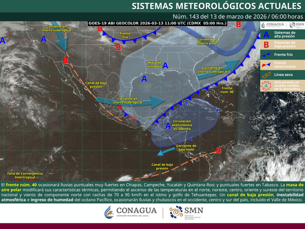 Lo anterior se debe a que el frente frío número 40 continuará desplazándose y entrará en proceso de debilitamiento sobre la península de Yucatán.