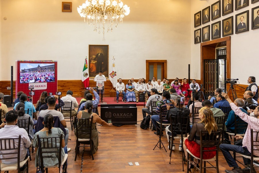 Al encabezar la conferencia de prensa desde Palacio de Gobierno, el Mandatario Estatal destacó los grandes logros del Presidente de México en su sexto y último Informe de Gobierno, especialmente los compromisos cumplidos con Oaxaca y el impulso de importantes proyectos para saldar la deuda histórica con el sureste del país.