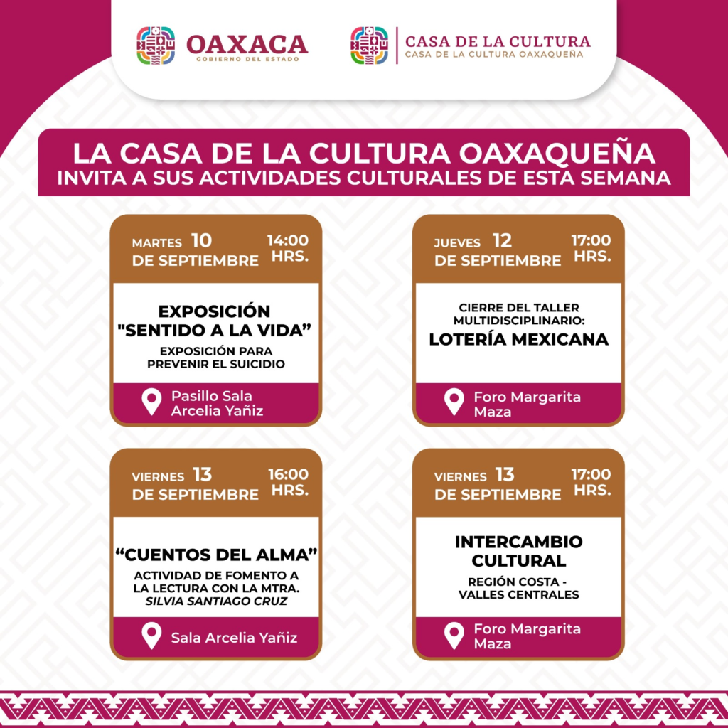 Este mismo día, en el Foro “Margarita Maza Parada”, a las 17:00 horas se realizará el Intercambio cultural entre las regiones de Valles Centrales y Costa.
