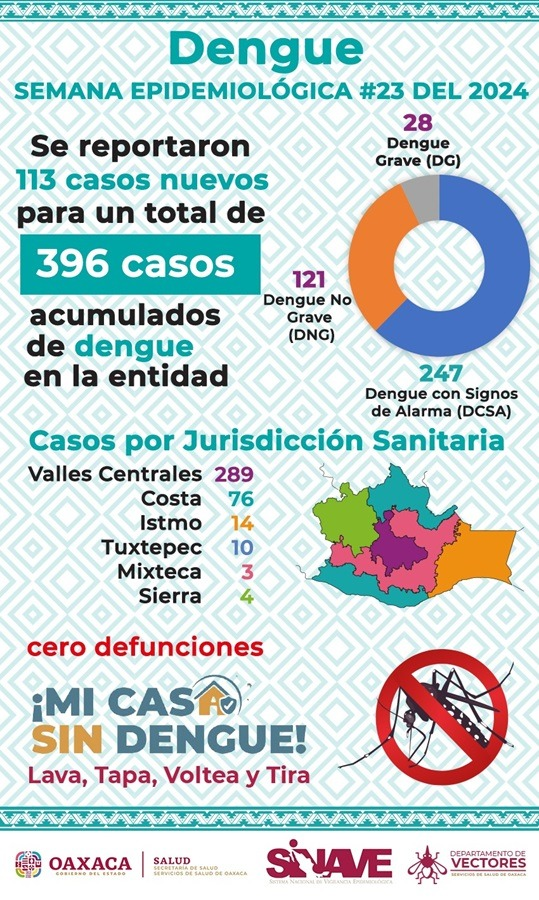Al dar a conocer el panorama epidemiológico de la semana número 23, la dependencia indicó que se registraron 113 casos nuevos de dengue en Oaxaca, que suman 396 acumulados confirmados, sin reporte de defunciones.